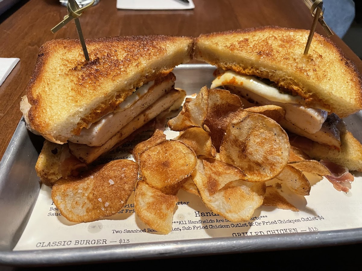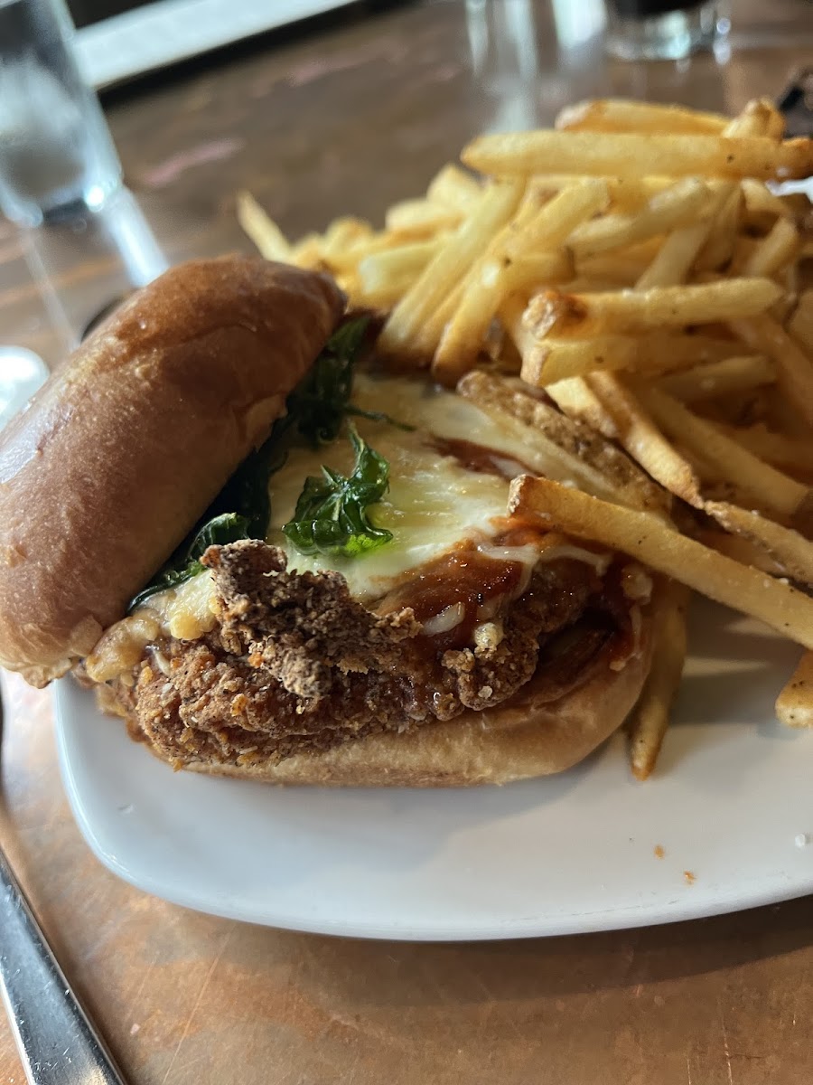 This restaurant is walkable distance from Nascar hall of fame, excellent for hanging out with a group and to watch sports on giant TV. They got a huge bar and a massive dining area. The restaurant in general has dark ambiance lighting with some sunlight from the front. I got the waffle and chicken from brunch menu. The waffle was really good but the chicken could have been more moist. The hot chicken biscuit was a good sandwich. We switched my fries for a salad, but then later found out I was charged for it. The staff were friendly. Food didn’t take too long to come out. It was a decent place to grab a casual quick bite.