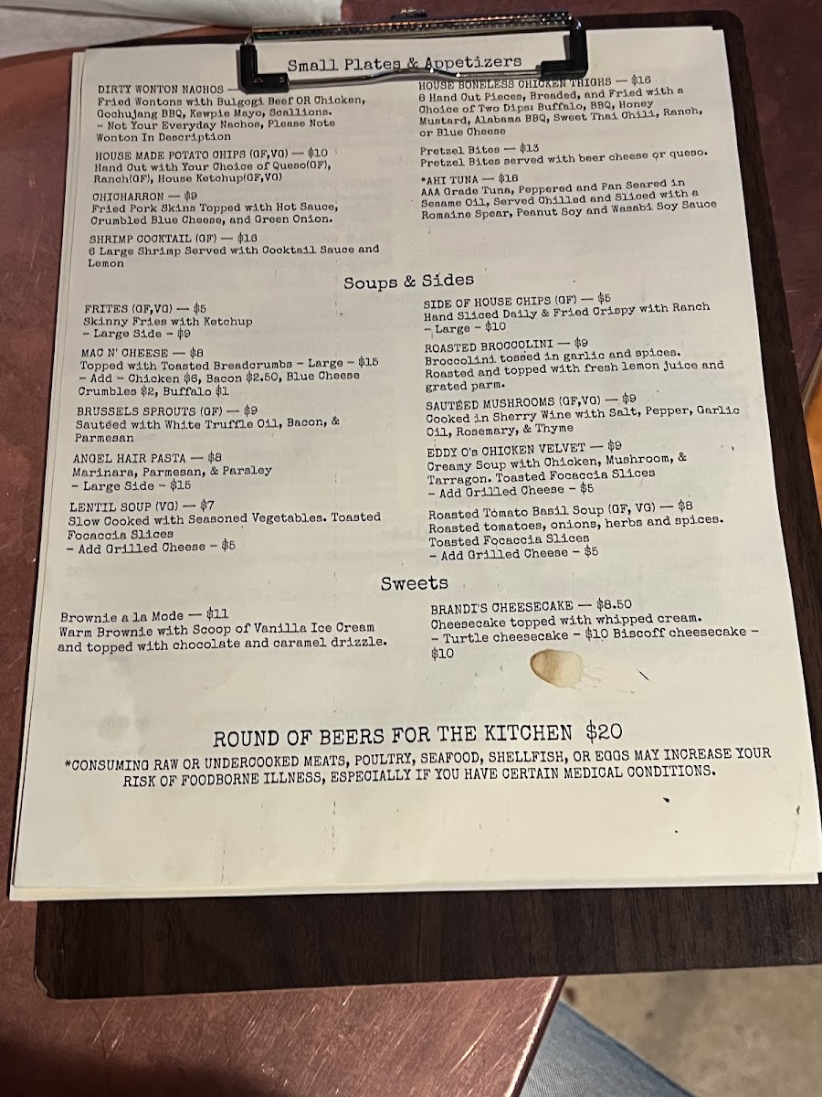 The food selection features satisfying dishes like Chicken Parmesan, a hearty House Burger paired with Brussels sprouts, and shareable small plates such as Dirty Wonton Nachos or Chicharron topped with blue cheese. These choices work well whether you’re meeting for dinner or grabbing a late-night bite amid the lively atmosphere.